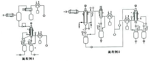 a)短程蒸餾器單級(jí)蒸餾單元: 經(jīng)預(yù)熱、脫氣后的物料進(jìn)入短程蒸餾器,輕組份被蒸發(fā)并在內(nèi)置冷凝器上冷凝,它和重組份從不同的通道分別排出(流程圖1)。 b)刮膜蒸發(fā)器和短程蒸餾器組合蒸餾單元: 大量的低沸物在刮膜蒸發(fā)器里被除去,產(chǎn)品的蒸餾在后級(jí)的短程蒸餾器里產(chǎn)生(流程圖2)。 |